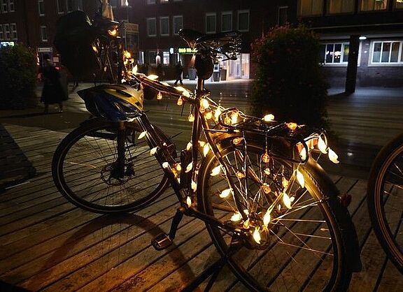 Eine abendliche „Lichterfahrt“ mit bunt geschmückten Fahrrädern Im Rahmen des ADFC Jugendforums zur beleuchteten Landmarke „Tiger & Turtle“