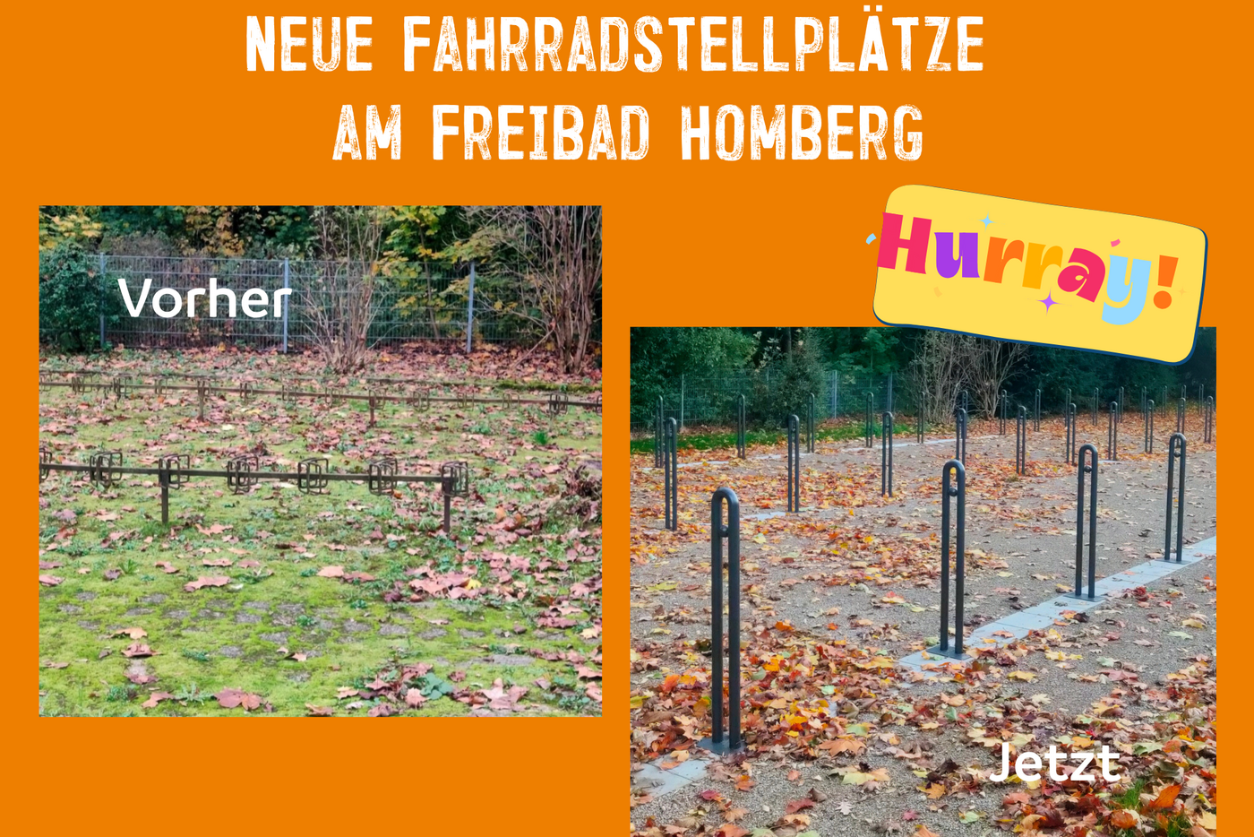 Toll, neue, moderne Fahrradstellplätze am Freibad Homberg! Die alten Fahrradabstellplätze wurden im August modernisiert und nutzungsfreundlicher gestaltet. Anlehnbügel ersetzen nun die in die Jahre gekommenen "Felgenkiller" und ermöglichen ein sicheres Anschließen der Fahrräder. Zusätzlich gibt es auch einige Lastenradstellplätze.
