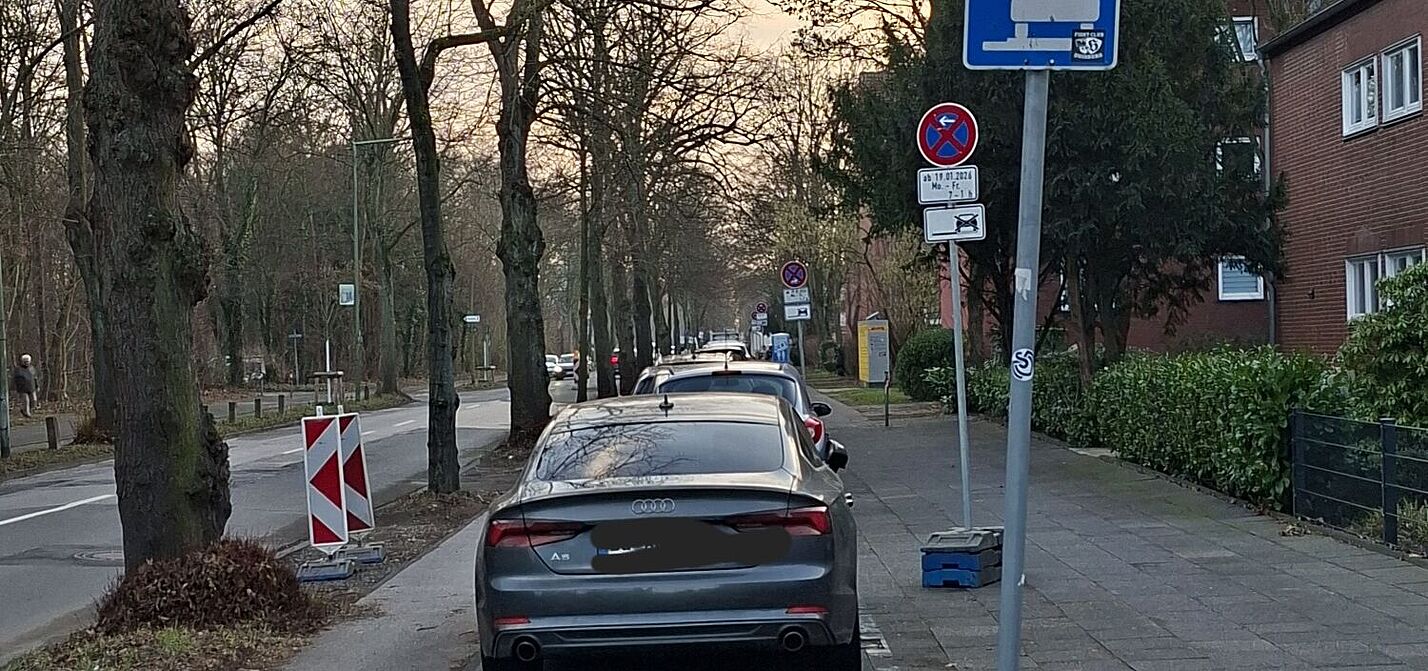 Der vorhandene Radweg ist sehr schmal und verläuft zwischen Bäumen und parkenden Kraftfahrzeugen (siehe Foto). Dadurch befindet er sich unmittelbar im Dooring-Bereich und stellt eine erhebliche Gefährdung für Radfahrende dar. Zudem bestehen erhebliche Zweifel, ob an dieser Stelle die Voraussetzungen für eine regelkonforme Anordnung des aufgesetzten Parkens gegeben sind.