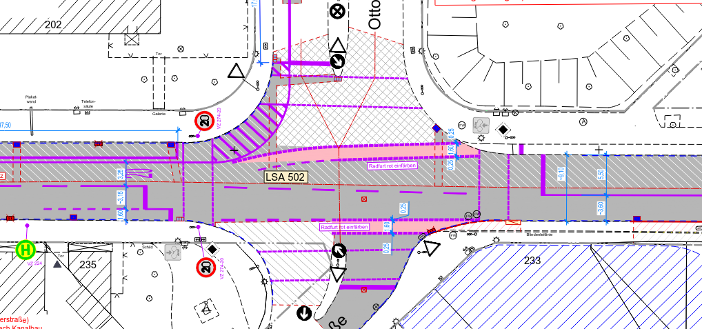 Die Temporeduzierung des Kfz-Verkehrs sollte bereits deutlich vor der Kreuzung Ottostraße erfolgen, um die Differenzgeschwindigkeiten bei der Fahrbahnzusammenführung zu minimieren.