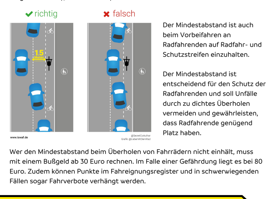 Die Notwendigkeit zum Abstandhalten ist vielen Autofahrenden weiterhin nicht bewusst. Auf etlichen Straßen ist ein gesetzeskonformes Überholen gar nicht möglich: Bei 1,5 Metern Mindestabstand, einer Fahrradbreite von z.B. 80 cm und dem oft auch von Radfahrern noch einzuhaltenden Abstand zu rechts parkenden Autos müsste eine Straße eine Breite von 5 Metern haben, damit z.B. ein VW Golf Radfahrende überholen dürfte. Aber auch Radfahrende selbst sind gefragt, sich den ihnen zustehenden Raum zu nehmen und, statt sich rechts an der Fahrbahn Richtung Parkstreifen drängeln zu lassen, auch mal ein hupendes Auto hinter sich zu ertragen, dessen Fahrer:in meint, ein Recht auf Tempo 50 zu haben.