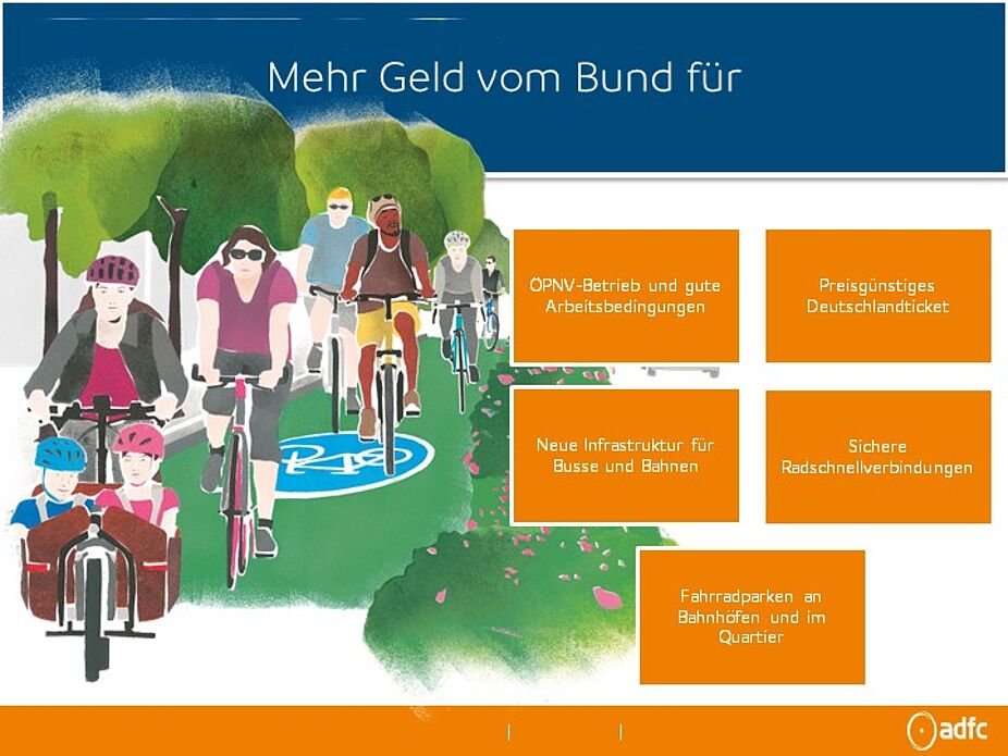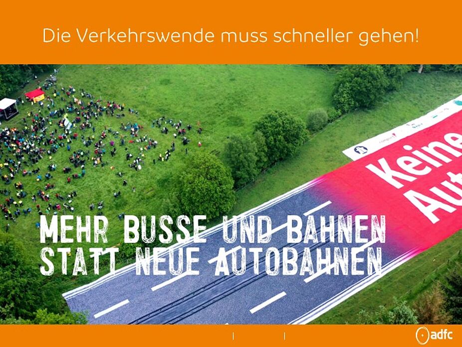 Der ADFC fordert für die Verkehrswende mehr und bessere Radwege, einen einfachen Umstieg in Bus und Bahn, die kostenlose Fahrradmitnahme und sichere Fahrradparkplätze an Haltestellen und Bahnhöfen.