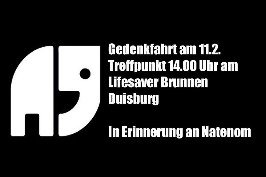 Der ADFC Duisburg organisiert mit Alltagsradler:innen in Duisburg eine Fahrraddemo im Stil eines Ride of Silence. Treffpunkt ist um 14 Uhr der Lifesaver-Brunnen auf der Königstraße. Die Route führt dann am Rathaus vorbei zum Fahrrad am Ruhrorter Kreisverkehr, einem der Gefahrenorte in Duisburg, an dem 2017 ein Fahrradfahrer verstarb. Die Tour endet vor dem Polizeipräsidium an der Düsseldorfer Straße. Neben dem Gedenken an Natenom fordern die Veranstalter die Stadtverwaltung, die politisch Verantwortlichen und die Polizei Duisburg auf, sich für die Sicherheit für Fahrradfahrende verstärkt einzusetzen und zu handeln.