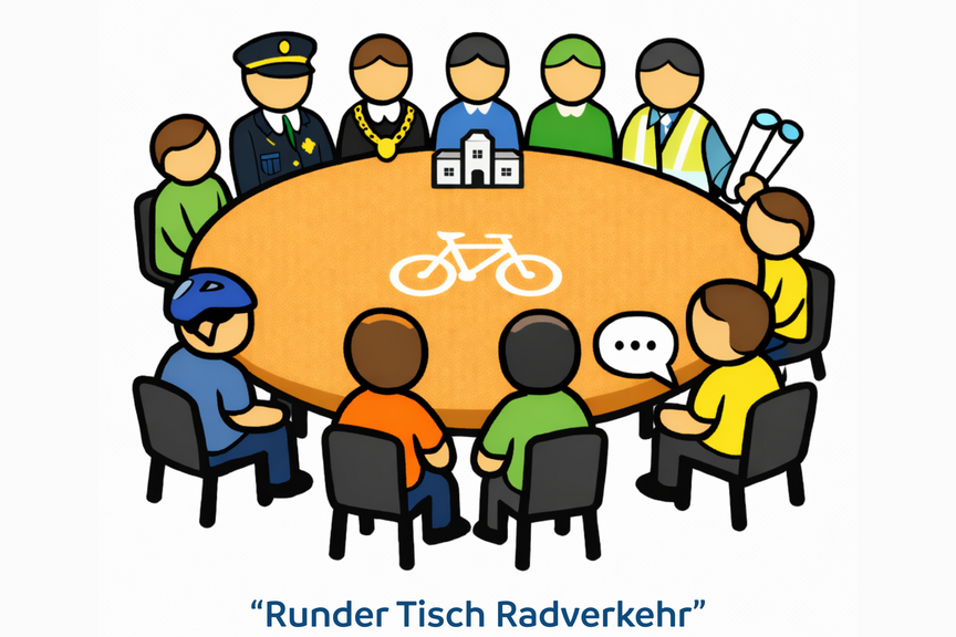 Viele Städte und Kreise in Deutschland haben einen "Runden Tisch Radverkehr". Das Konzept ist überall ähnlich: Die Kommune lädt alle zwei bis drei Monate Bürgermeister:innen, Ratsmitglieder, zivilgesellschaftliche Organisationen wie den ADFC, die Polizei, die Verkehrsgesellschaft und Mitarbeiter:innen der Kommune aus den Bereichen Stadtentwicklung, Verkehrslenkung, Straßen- und Verkehrsplanung und Verkehrstechnik ein, um über die Umsetzung der örtlichen Radverkehrskonzepte, über Radverkehrsförderung, Verkehrssicherheit und Infrastrukturplanung zu beraten.